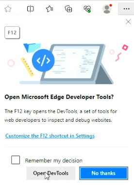 1. Open Microsoft Edge browser, then press F12 or FN+F12 on some laptops and click Open DevTools.
