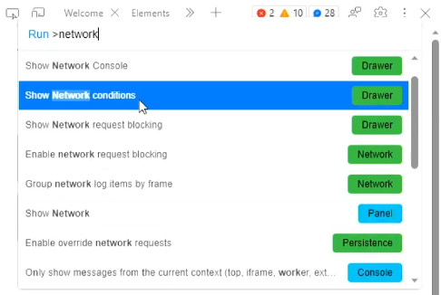 2. Press CTRL+SHFT+P, then type “network conditions”, then press Enter.
