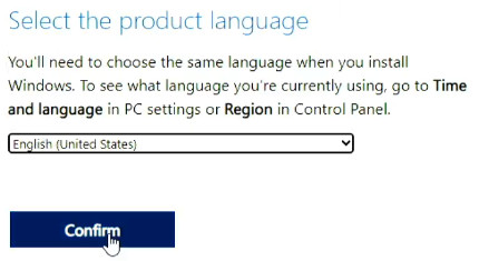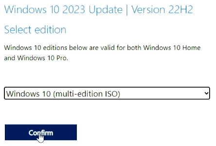 6. Select Windows 10 (multi-edition ISO) from the drop-down box. Then click Confirm.