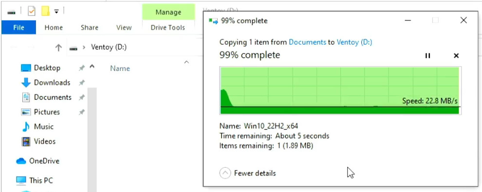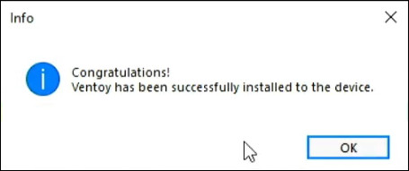 6. When finished you will get a Congratulations message, click on the OK button. Close Ventoy2Disk and go copy your ISO files to your new Ventoy drive.