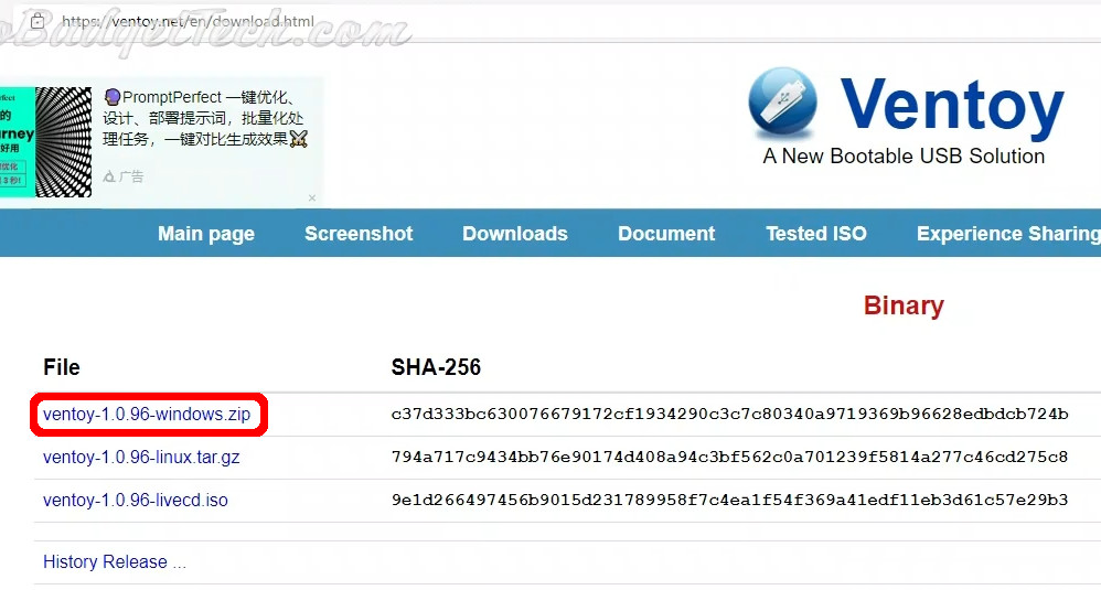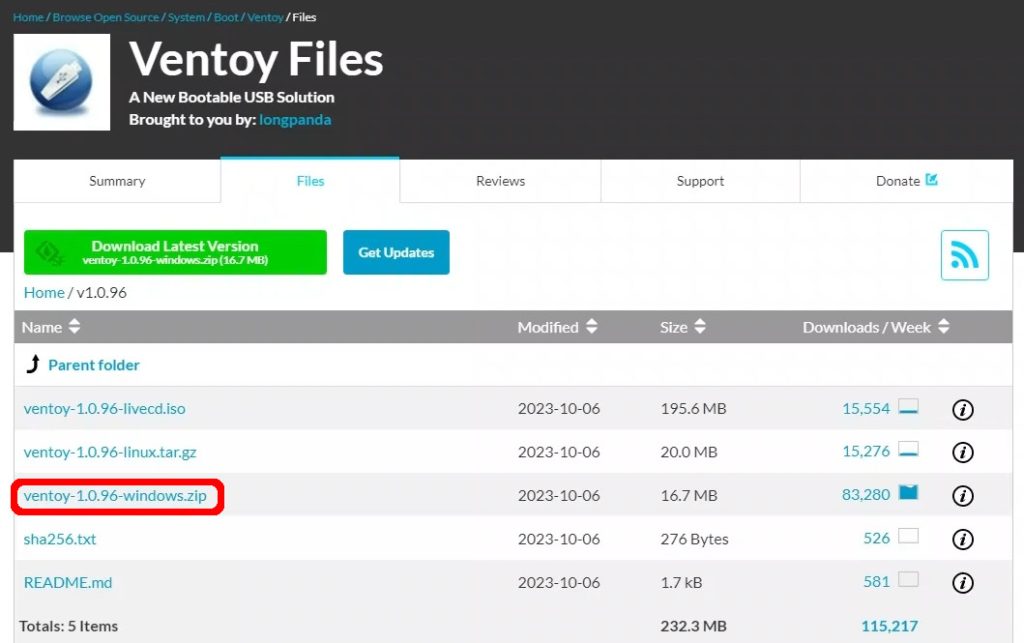 1. Open your favorite web browser and navigate to the official Ventoy website at ventoy.net and click on Downloads. Find the link that looks like ventoy-<version_number>-windows.zip (as of writing, the latest is ventoy-1.0.96-windows.zip.), click on it to open the download site (recently changed to sourceforge.net as of writing). Then click on the same named link to start the download.