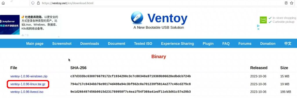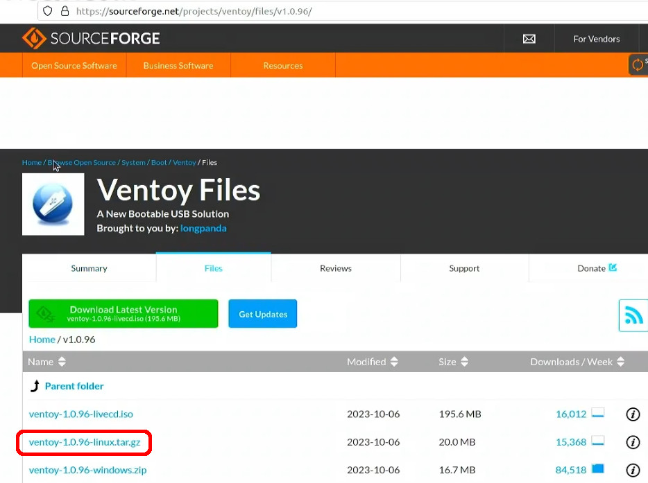 1. Open your favorite web browser and navigate to the official Ventoy website at ventoy.net and click on Downloads. Find the link that looks like ventoy-<version_number>-linux.tar.gz (as of writing, the latest is ventoy-1.0.96-linux.tar.gz.), click on it to open the download site (recently changed to sourceforge.net as of writing). Then click on the same named link to start the download.