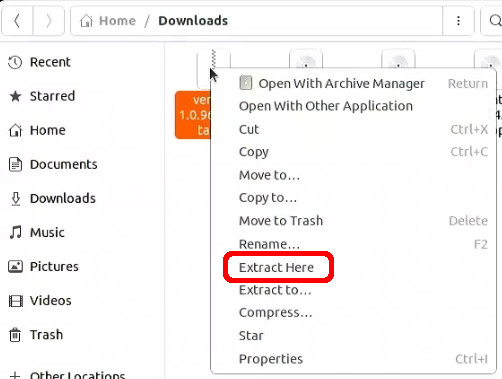 2. The .tar.gz file (pronounced tarball among *nix users) should have downloaded and fairly quickly too because it is quite small. Open your Downloads folder in File Explorer (Nautilus in vanilla Ubuntu), find the ventoy tarball file, right-click and select Extract Here menu item.