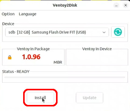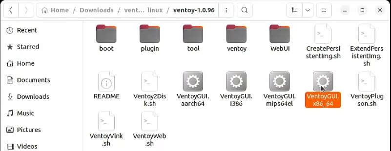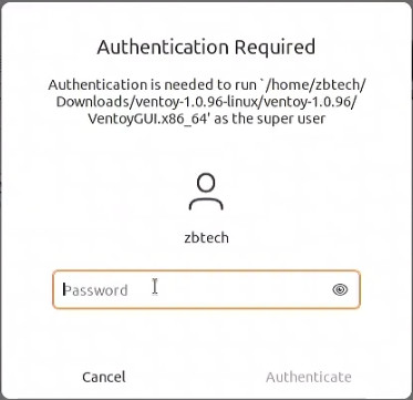 4. Open the new ventoy folder and look for VentoyGUI.<cpu-arch> (usually VentoyGUI.x86_64), you may have to go into one more ventoy folder to find it. Double-click on VentoyGUI.<cpu-arch> to run it. You will have to grant permission by using your password (Your user must be either root or a member of sudoers). In the Device drop-down, verify that is the correct USB drive. (I like to only plug in one drive when doing this so I do not overwrite any of my other drives.)