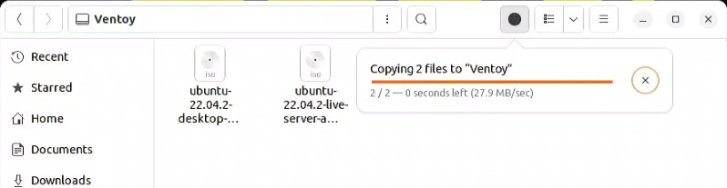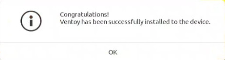 6. When finished you will get a Congratulations message, click on the OK button. Close VentoyGUI and go copy your ISO files to your new Ventoy drive.